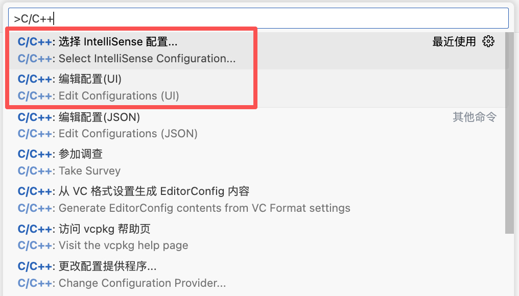 再次打开命令面板command + shift + P(⇧⌘P)并输入“C/C++”,从编译器的下拉菜单中选择“编辑配置(UI)”进行配置。