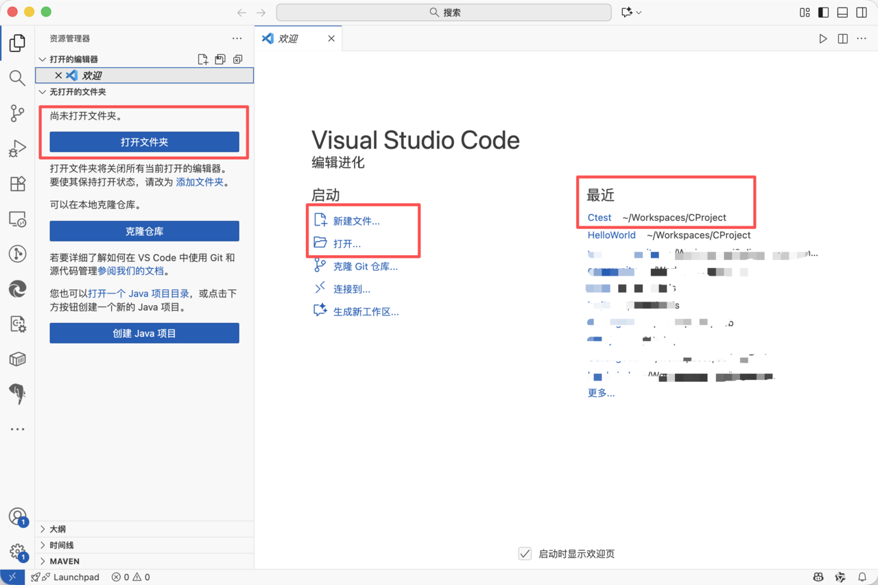 在 MacOS 合适的位置(例:个人用户名文件夹下)手动创建一个名为projects的空文件夹,您可以在其中存储所有VS Code项目,然后创建一个名为helloworld的子文件夹,打开 VS Code,在左侧边栏,或者欢迎页等打开你所创建的文件夹