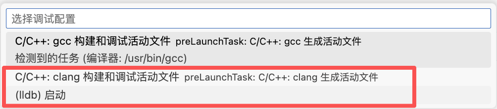 - 从系统上检测到的编译器列表中选择C/C++:clang++构建和调试活动文件(您只会被要求在首次运行或debughelloworld