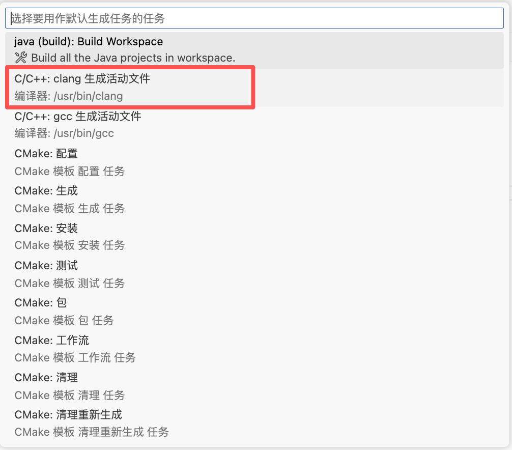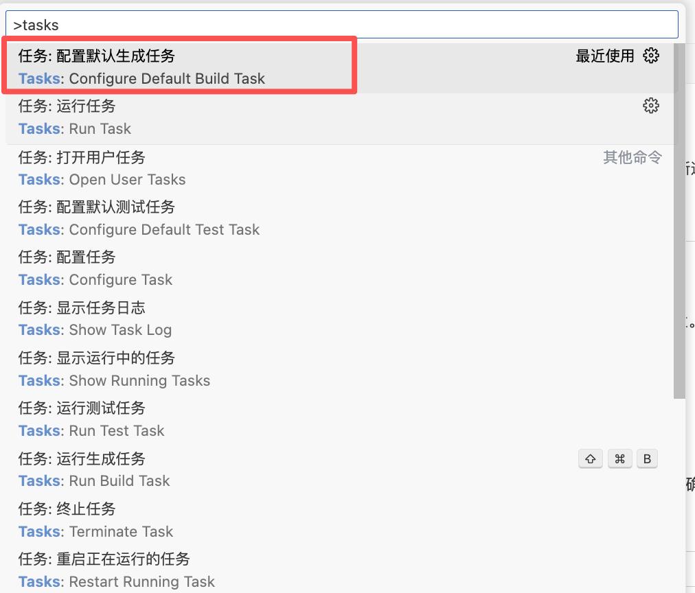 如果 tasks.json 丢失或者没有自动添加,可以打开命令面板command + shift + P(⇧⌘P)(或手动点击顶部的地址栏,手动选择“显示并运行命令”)并输入“tasks”,从编译器的下拉菜单中选择“任务:配置默认生成任务”,然后选择 “C/C++:clang 生成活动文件”, 会自动添加 tasks.json。