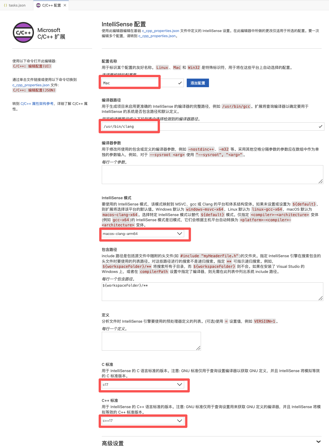 为了更好地控制C/C++扩展,请创建一个c_cpp_properties.json文件,它允许您更改设置,例如编译器的路径、包括路径、要编译的C++标准(例如C++17)等。